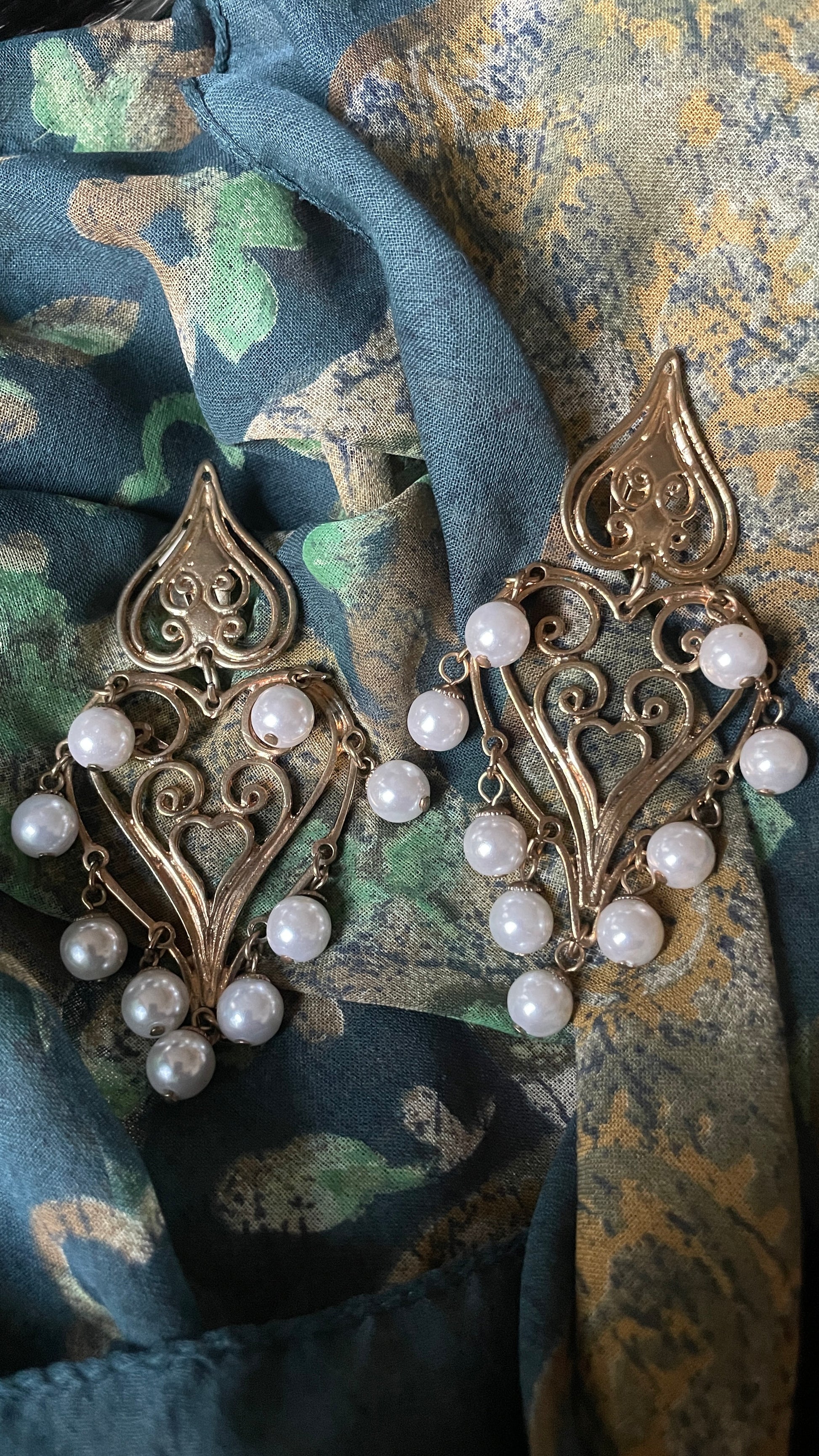Beautiful earrings with faux pearls. They’re clip-ons but on the top of the heart is a little hole were a hook or stud could be attached. Not too heavy.