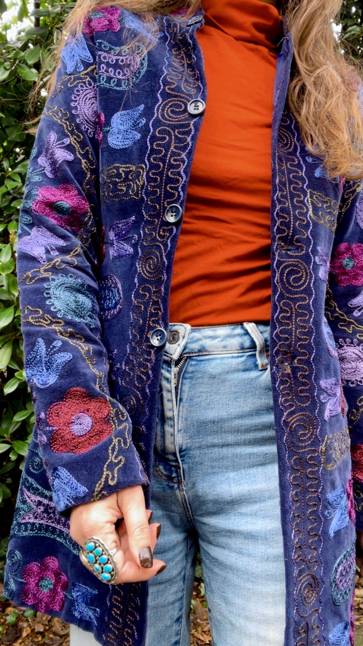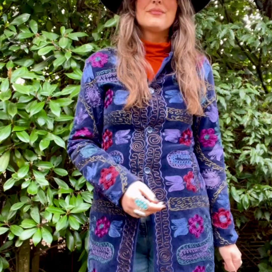 Such a timeless beauty. This Uzbek Suzani coat is a work of art. Deep dark blue velvet base with traditional embroidery. Closes with buttons in the front and has two pockets. Light shoulder pads give some shape. Pairs very well with a shearling collar, just saying.