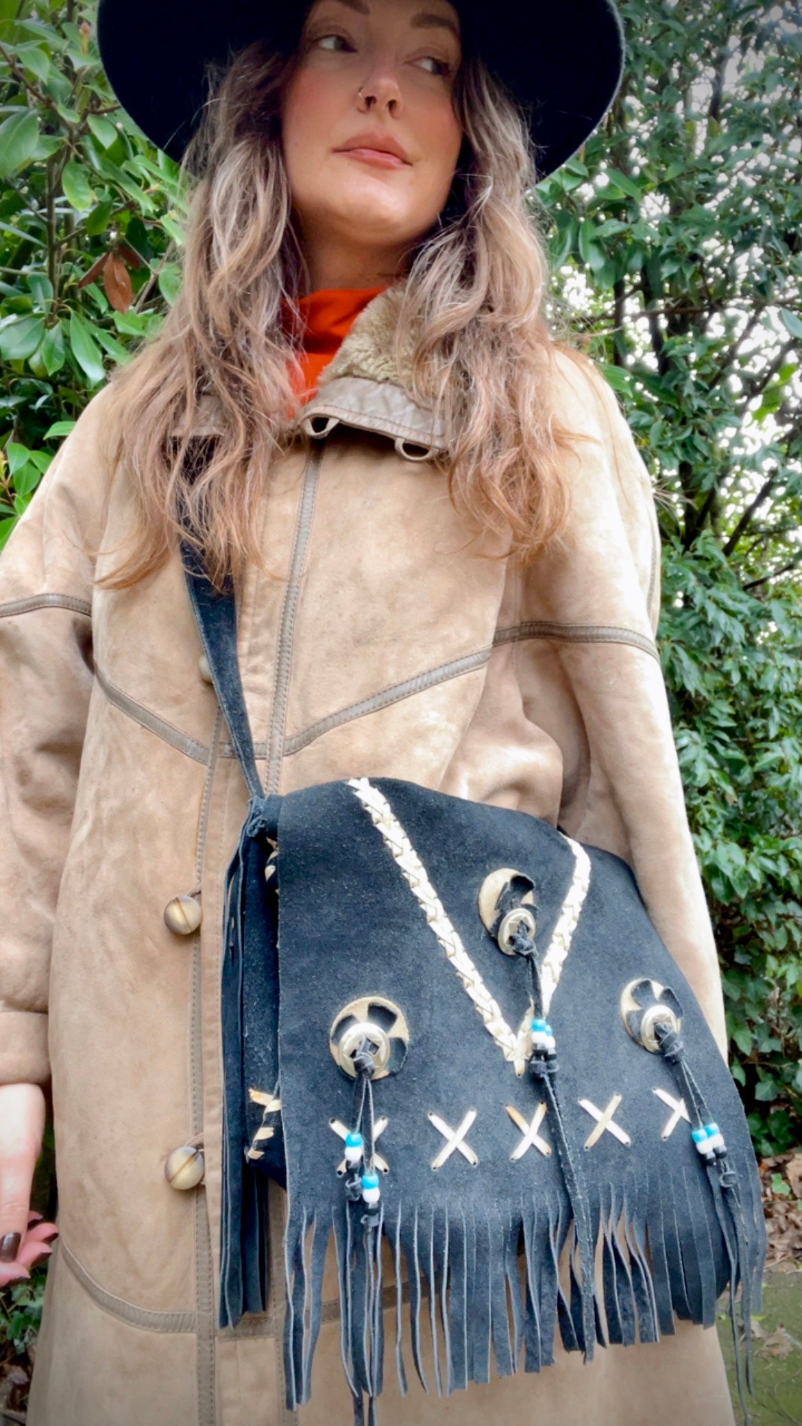 Super cool suede messenger bag in western style. This one mixed practicality and beauty in one. Perfect for work days and everyday life.