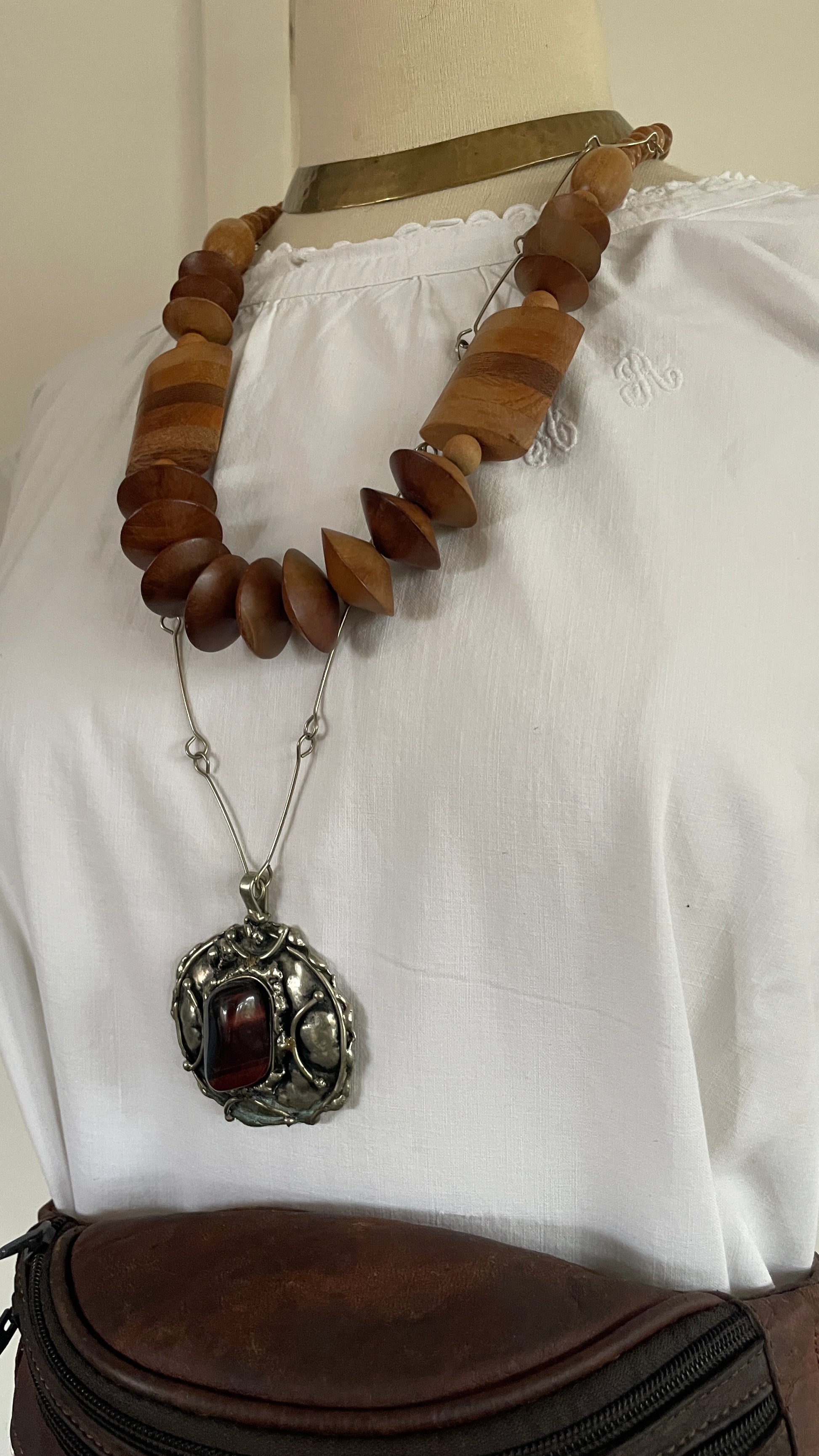 Gorgeous necklace made out of several wood types beads. Closes in the back with a twist.